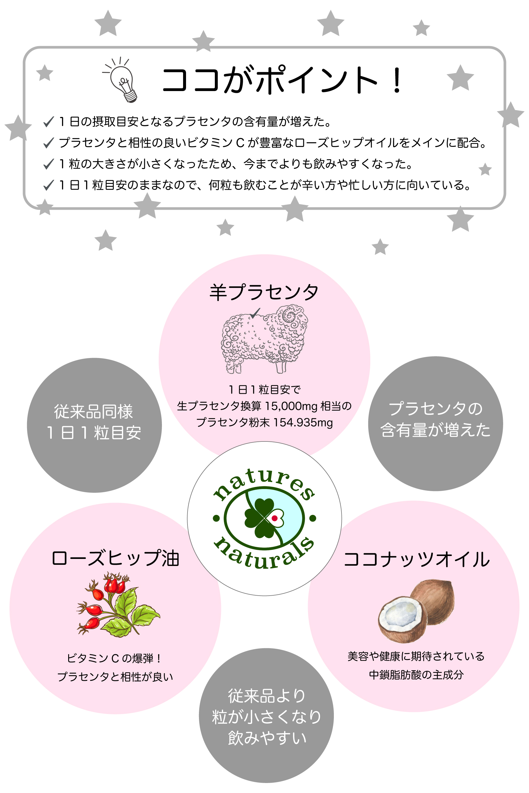 1粒あたりに生換算15,000mg相当の羊プラセンタパウダー154.935mg、ローズヒップオイル141.5mg、ココナッツオイル105mg |